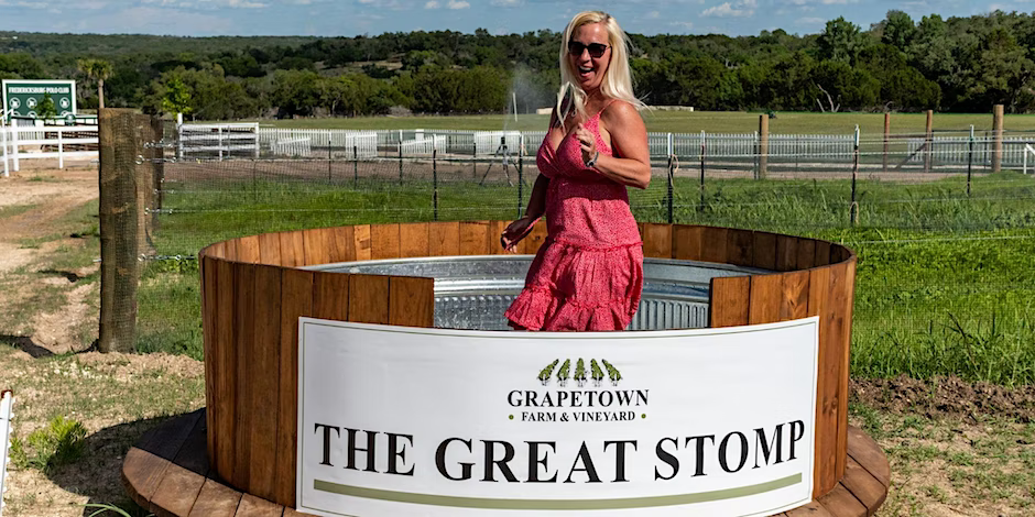 Wine, craft cocktails, grape stomping and music! This casual Grape Stomp is held in Fredericksburg Texas at the Grapetown Winery and Fredericksburg Polo Club! Grape Stomps are at 3PM (ish).Grape Stomps are open to all guests! Come enjoy a day in the Texas Hill Country. Family and pet friendly, held on a beautiful property with donkeys, goats, alpacas and more to meet! Safari Wine Tours (no pets allowed) to meet our Zebras, Camels and more are also available but must be purchased in advance (www.grapetownvineyard.com)