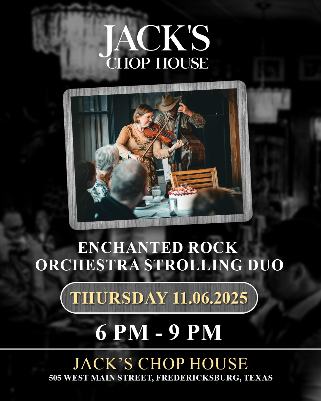 Categories Jacks Chophouse Live Music Jacks Chophouse Post author By chrchcol Post date July 3, 2023 No Comments on Jacks Chophouse ← Martinis → Bankersmith Leave a Reply Cancel replyYour email address will not be published. Required fields are marked *Comment * Name * Email * Website Save my name, email, and website in this browser for the next time I comment.